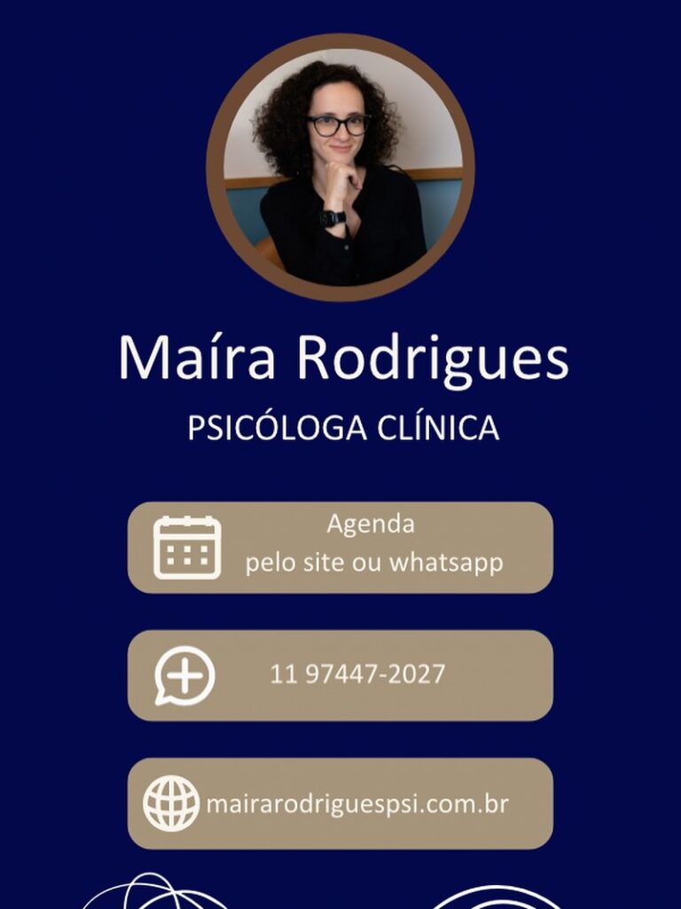 Olá, eu sou Maíra Rodrigues, psicóloga formada pela USP e especialista em Terapia Cognitivo-Comportamental (TCC). Estou finalizando minha pós-graduação em TCC e também realizei cursos complementares em Ansiedade e Depressão pelo Hospital Albert Einstein.